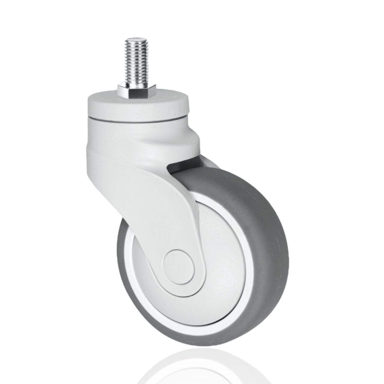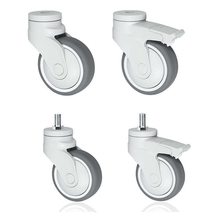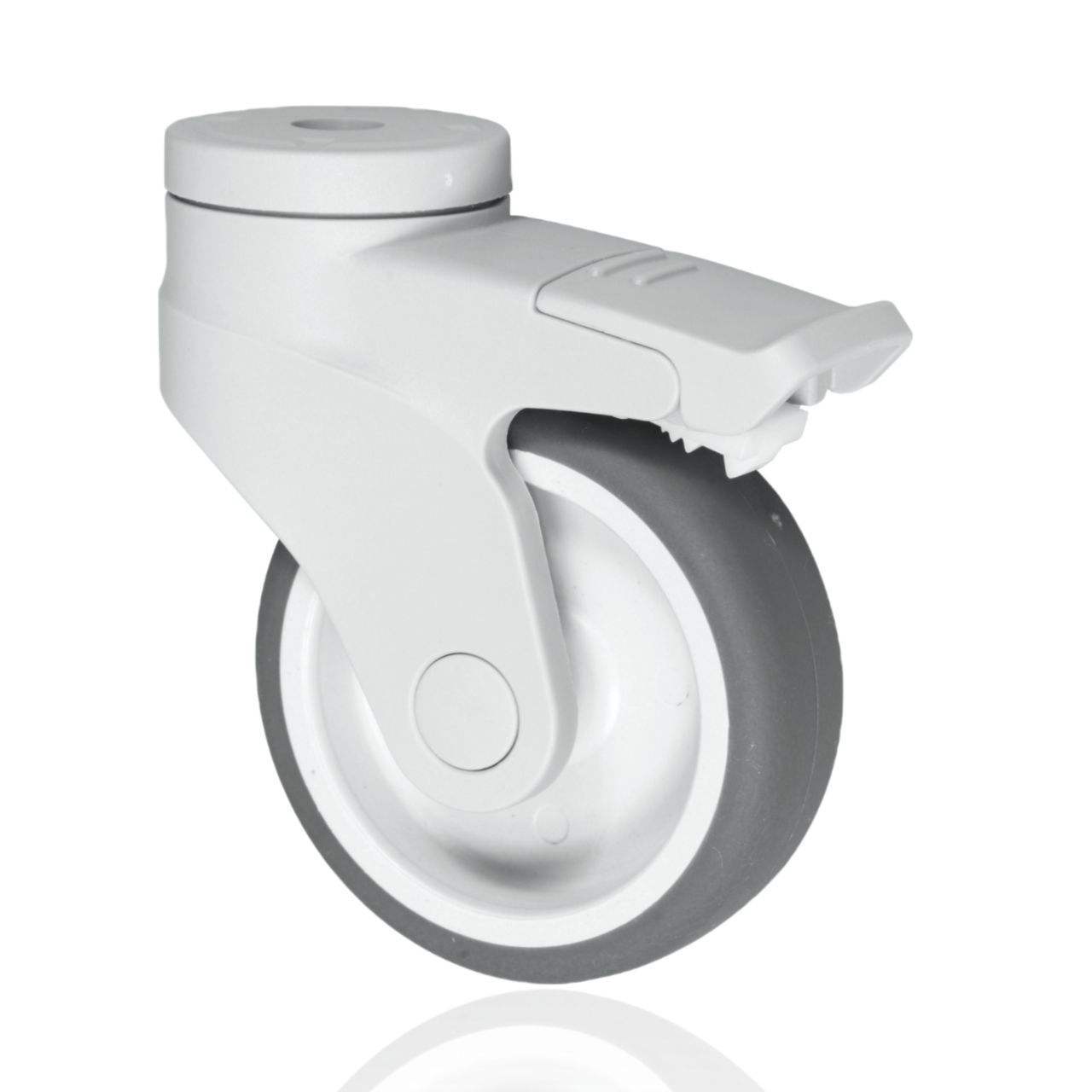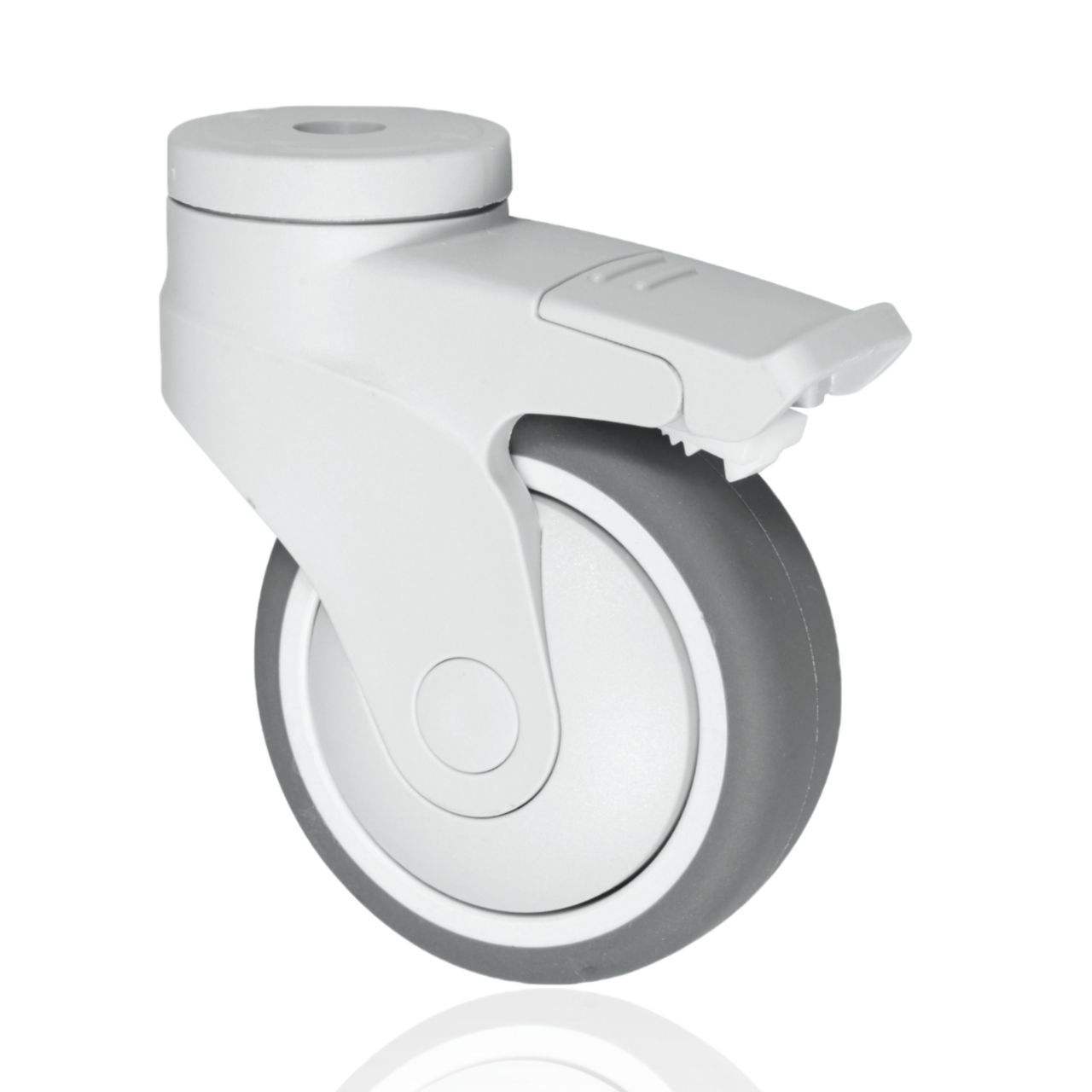 This 4 inch (100 mm) bolt hole swivel Medical caster with total lock brake is specially manufactured for medical and hospital applications, providing silent, smooth, and safe mobility for hospital beds, medical trolleys, and equipment. Featuring a soft grey TPR (thermoplastic rubber) tread on a durable PP (polypropylene) core, it ensures excellent floor protection, low noise, shock absorption, and non-marking performance in sensitive healthcare environments. The total lock brake simultaneously locks both swivel and wheel for maximum stability.